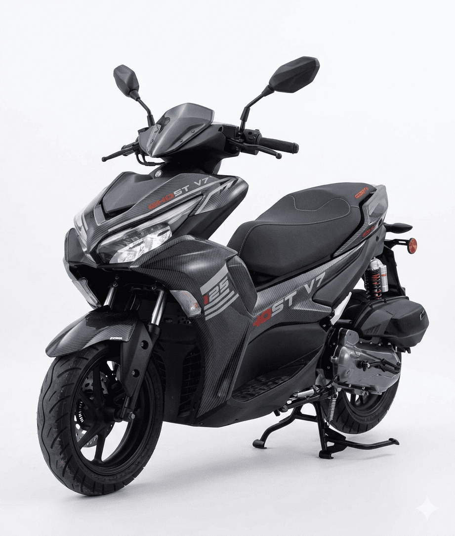 Le Ghost V7 moto 125CC est un scooter au design agressif et ultra-moderne, conçu pour ceux qui recherchent un style sportif affirmé combiné à une grande agilité urbaine. Avec sa finition soignée et ses lignes tranchantes, il se démarque immédiatement sur la route.